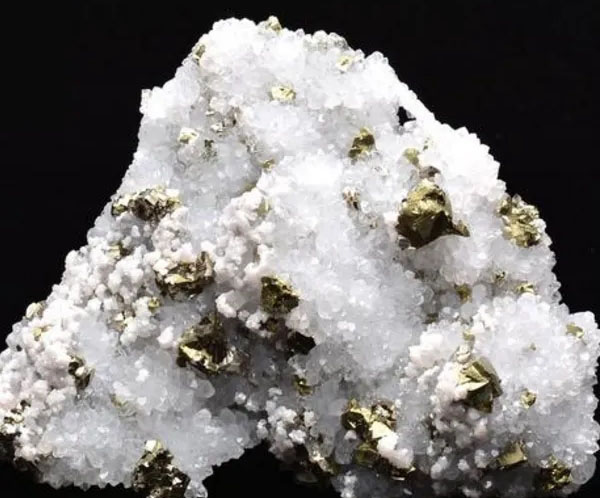 貳哥的一個(gè)熟人跟貳哥說了一件事。他老丈人在街上買了一塊挺漂亮的石頭,白色的石英晶體上有好多黃色顆粒,顆粒有棱角,賣石頭的人說石金礦石,黃色顆粒狀是金粒和狗頭金。他老丈人花了2萬5千元把石頭買了回來,石頭有兩個(gè)拳頭大小,重六斤多。這石頭其實(shí)不是金礦石,是黃鐵礦(如下圖),黃色的顆粒是黃鐵礦的結(jié)晶體。他老丈人得知自己上當(dāng)后,氣的差點(diǎn)上了醫(yī)院。熟人的意思是讓貳哥在網(wǎng)上普及一下黃鐵礦的知識,避免更多的人上當(dāng)受騙。