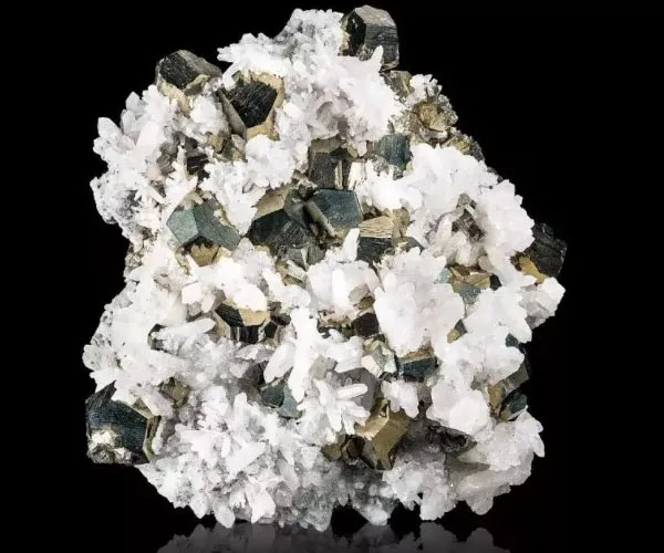 黃鐵礦結(jié)晶體又稱為愚人金,主要成分為二硫化亞鐵,外觀造型也是跟地址環(huán)境有關(guān),最常見的就是正方體狀,是熱液礦脈中出現(xiàn)的完美晶體,黃鐵礦結(jié)晶體還會出現(xiàn)八面體、五角十二面體等。黃鐵礦結(jié)晶體看起來相當(dāng)漂亮,有一定的觀賞價(jià)值。黃鐵礦伴隨水晶晶看起來更加漂亮:黃色晶體在白色半透明的石英襯托下更顯得璀璨奪目。聽聽愚人金這名字就知道,好多人把這種礦石誤認(rèn)成黃金。